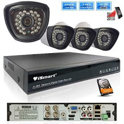 iSmart 4 Channel 720P HDMI AHD DVR HVR NVR with 500G HDD 3 in 1 Security System including 4 1200TVL 1.0MP Waterproof Bullet Surveillance Camera with 27 IR Leds Night Vision Up to 80ft Remote View