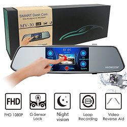 ◆HD Dash Cam with Back Camera -1080P front mirror camera and VGA back up camera,both cameras are captured by the dvr simultaneously ◆Anti-glare Mirror Screen -anti-glare mirror screen with