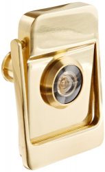 The Rockwood 614V.3 cast brass door knocker has a built-in door viewer and a polished clear coated finish (ANSI/BHSM number US3/605). There is a space for engraving a name