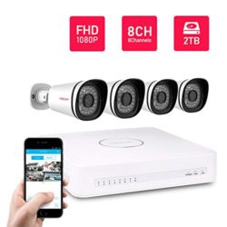 Foscam FN7108E-B4-2T Features – Pre-installed 2TB hard drive (up to 4TB), supports 24/7 recording – Motion detection alert push to email and FTP – 30 IR LEDs for 65.6 feet IR range, deter intruder under the cover of night – Weatherproof mini bullet cameras, compact design applicable to indoor and outdoor surveillance – Circuit protection design to ensure the security and stable performance of system – USB 3.0 data transfer, 10 times faster than USB2.0- HD-OUT: connect via HD cable to HDTV What’s in the Box – 8-channel NVR with pre-installed 2TB hard drive x 1 – 1.5M (5ft) Ethernet Cable x 1 – Power Adapter for NVR x 1 – USB Mouse x 1 – 1.8M (5.9ft) HD Cable x 1 – 1080P Bullet IP Camera x 4 – Screw Pack x 4 – 25M (82ft) Ethernet Cable x 2 – 15M (50ft) Ethernet Cable x 2 – Quick Installation Guide x 1 – Quick Operation Guide x 1 – Security Warning Card x 1 Warranty 1 Year Warranty Product Features This system use standard 802.3af