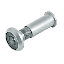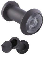 Solid brass housing with plastic lense. Maximum door or panel thickness is 3/4 in. , wood or metal doors. Easy to install viewer. Bore diameter is 9/16 in. .