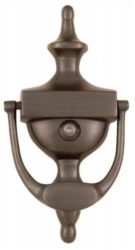 The Rockwood 614V.10B bronze door knocker has a built-in door viewer and a satin oxidized oil rubbed finish (ANSI/BHSM number US10B/613). There is a space for engraving a name