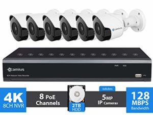 Included: (1) 8 Channel NVR with pre-installed 3TB storage, (6) IP PoE 5MP bullets with built-in microphone Camius 4K NVR supports up 8 HD IP channels; VGA & HDMI
