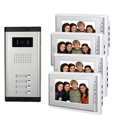 This System includes 1 outdoor color camera with 4 call buttons,7 inch color LCD screen 4 pcs,Support night vision. When someone press the call button on outdoor unit, it